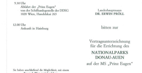 Nach jahrzehntelangen Planungsarbeiten, heftigen öffentlichen Diskussionen und lokaler Gegnerschaft sowie langwierigen politischen Verhandlungen erfolgte am 27.10.1996 im Burghof auf dem Hainburger Schlossberg durch Umweltminister Martin Bartenstein und die LandeshauptmĂ€nner Erwin Pröll und Michael HĂ€upl die feierliche Unterzeichnung der Vereinbarung gemÀà Artikel 15a B-VG zwischen dem Bund und den LĂ€ndern Niederösterreich und Wien zur Errichtung und Erhaltung eines Nationalpark Donau-Auen. Die nötigen landesgesetzlichen Rechtsgrundlagen fĂŒr den Nationalpark wurden 1996 finalisiert. Mit Jahresbeginn 1997 nahm die Nationalpark Donau-Auen GmbH als neu geschaffene, lĂ€nderĂŒbergreifende Nationalpark Verwaltungs- und Managementorganisation ihren Betrieb auf und löste die Provisorische GeschĂ€ftsstelle Nationalpark Donau-Auen ab. Auf den folgenden fĂŒnf Unterseiten sind zahlreiche Dokumente verfĂŒgbar, die die Ereignisse und Ergebnisse der Errichtungsphase des Nationalpark Donau-Auen im Jahr 1996 illustrieren.